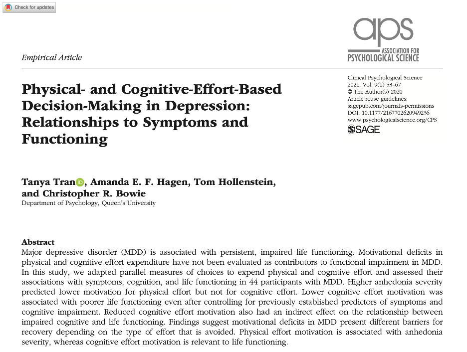 For her MSc thesis, Tanya Tran developed a new paradigm to assess cognitive effort avoidance. With this task, in a paradigm similar to the commonly used EEFFRT task by Treadway, examined how those with depression reacted to choices to seek more reward for an effortful task or a lower reward for an easy task. The traditional EEFFRT task showed relationships with the symptom of anhedonia, but only the cognitive effort task showed relationships with everyday functioning. The cognitive effort task also mediated the relationship between cognitive ability and everyday functioning, suggesting that those with depression might be at risk for more challenges functioning in daily life because of their cognitive deficits and a preference to avoid tasks that are more cognitively taxing.
